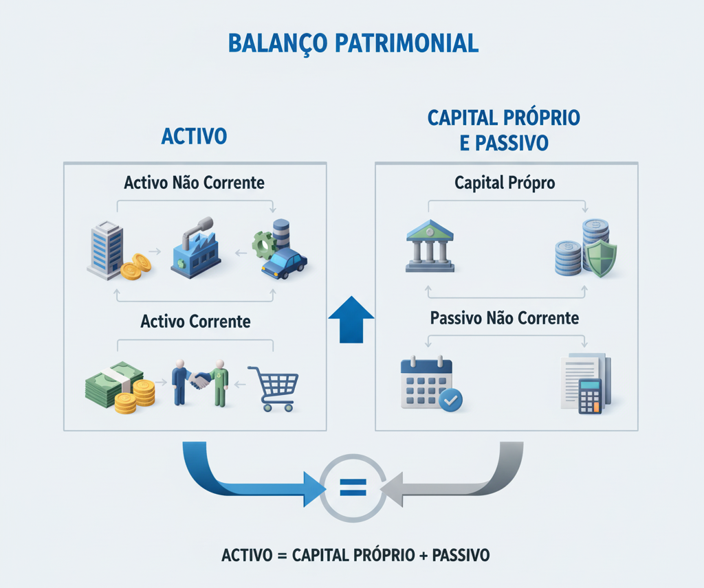 Ativo Não Corrente (ou Fixo): bens e direitos de permanência superior a um ano, como imóveis, equipamentos, viaturas, investimentos a longo prazo, etc.