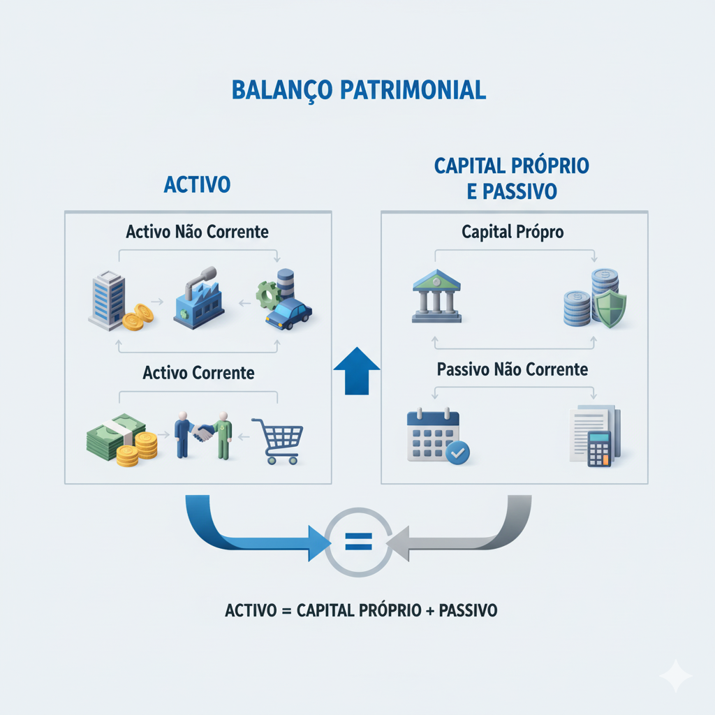 Ativo Não Corrente (ou Fixo): bens e direitos de permanência superior a um ano, como imóveis, equipamentos, viaturas, investimentos a longo prazo, etc.
