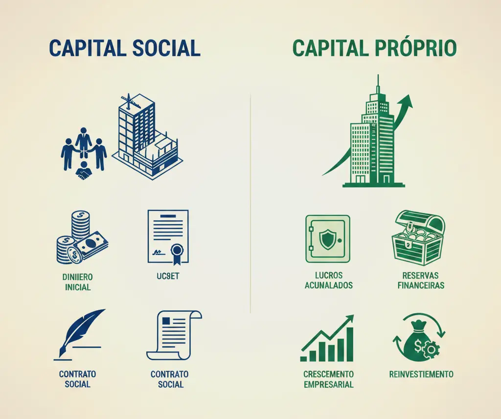 Capital social é o valor que os sócios colocaram na empresa e só muda com alteração formal. Capital próprio é o valor que a empresa realmente vale para os sócios em determinado momento, variando conforme lucros ou prejuízos.