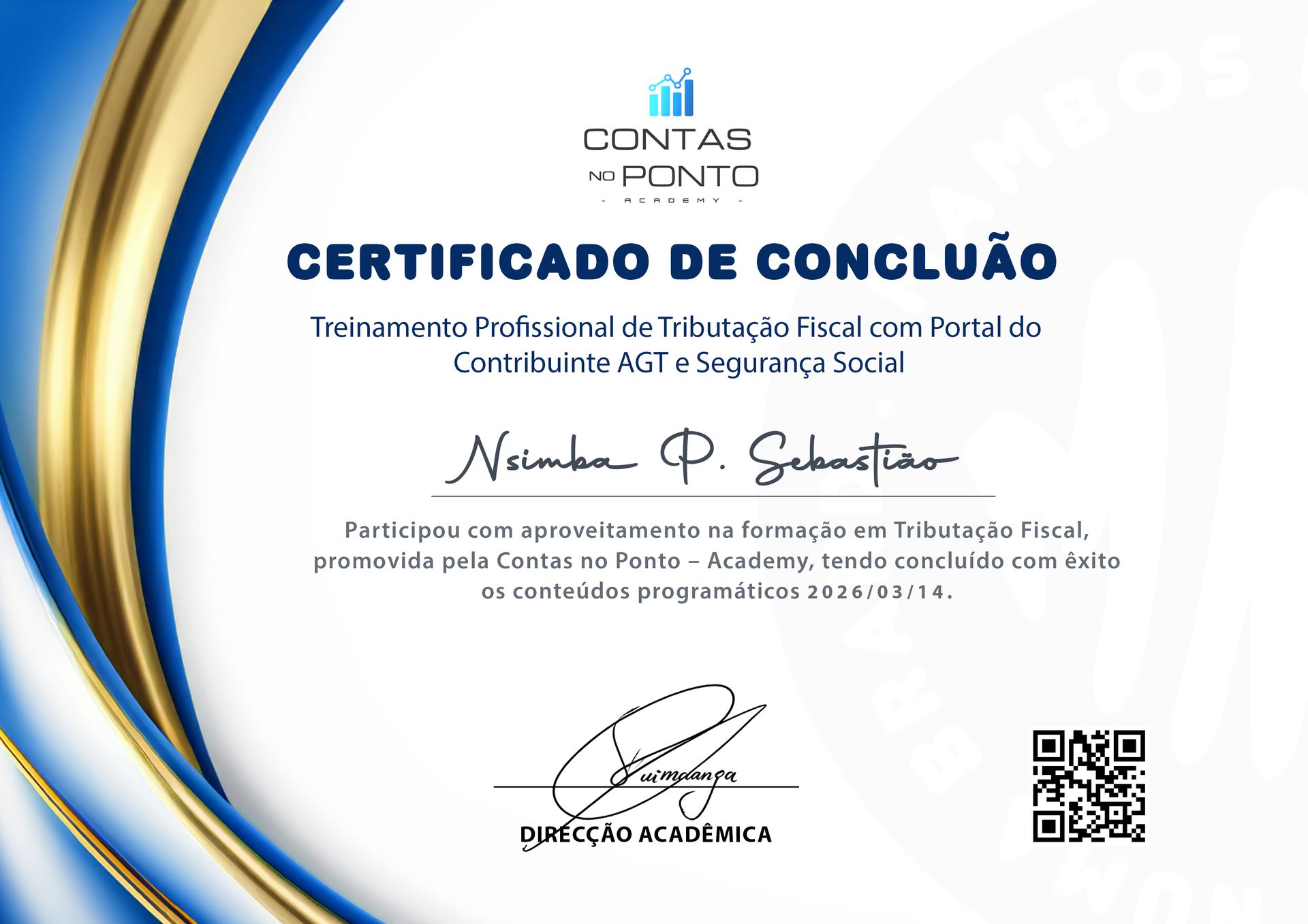 Certificado do Treinamento Profissional de Tributação Fiscal com Portal do Contribuinte AGT e S.S primeira Edição | Primeira Edição 14/03/2024