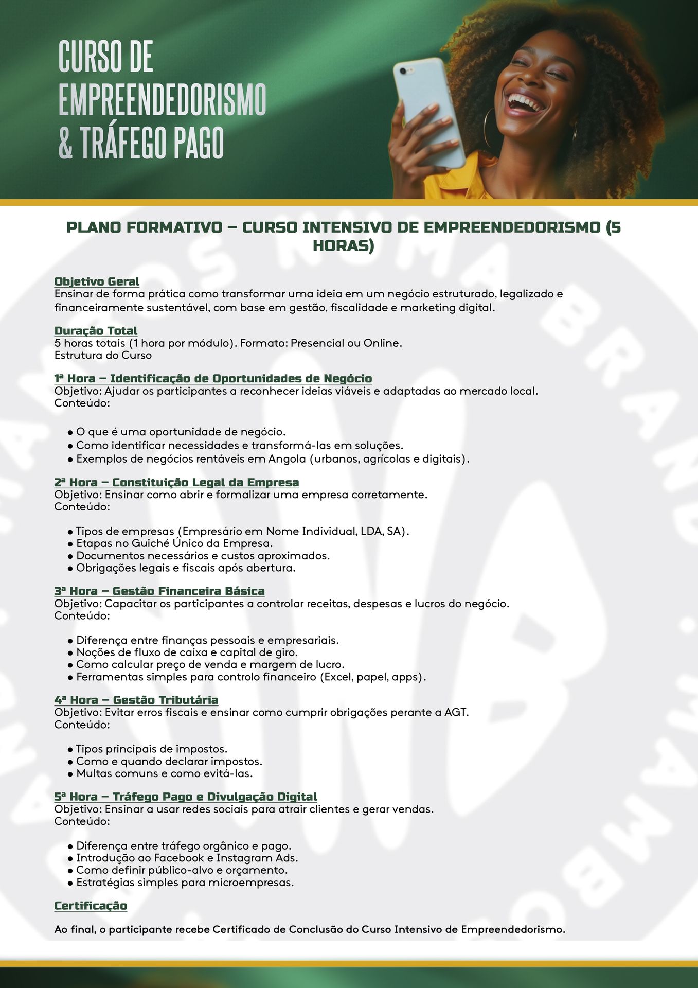 O Curso de empreendedorismo e tráfego pago visa capacitar a juventude na identificação de oportunidades de negócios, torna-lo em um negócio rentável através de técnico de venda com tráfego pago, garantindo sucesso do mesmo através de uma boa gestão financeira, dentro dos parâmetros da legalidade societário e fiscal.NESTE CURSO VOCÊ VAI APRENDER: